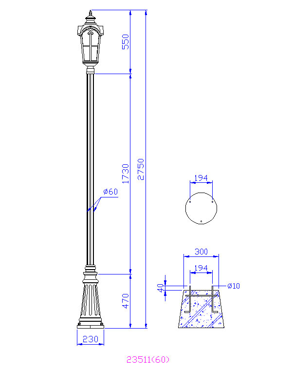 MATER|AL(¼ÒÀç) : Aluminium Die Casting Body PMMA cover/PC cover DIFFUSER bolt/nut stainless steel SIZE(mm) : H2,750 LAMP : LED 30W(¡¾) VOLTAGE : 220V / Á֯ļö(F) : 50~60 Hz ¿ª·ü (PF) : >0.95 COLOR : Warm White / Pure White ( ¡î ) LED BRIGHTNESS : Pure White 5300~6000K (Typ 5600K) Warm White 2900~3200K (Typ 3000K) COLOR RENDERING INDEX : CRI 80 ÀÌ»ó Life Span : 50,000 Hr (ȯ°æ¿¡µû¶ó ´Ù¸§) SERVICE(¿ëµµ) : Plaza, Park, Lawn, Residential areas