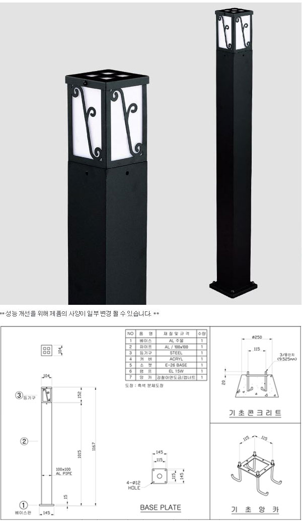 (¼ÒÀç) : Steel (power coating) Body Acryl cover DIFFUSER bolt/nut stainless steel SIZE(mm) : ¤±104 H1167 LAMP : LED 8W VOLTAGE : 220V COLOR : Warm White / White option SERVICE(¿ëµµ) : Plaza, Park, Lawn, Residential areas (¡Øµî±â±¸ »ö»ó, Ä¡¼ö µî »ç¾çÀÌ Á¶±Ý ´Ù¸¦ ¼ö ÀÖ½À´Ï´Ù)