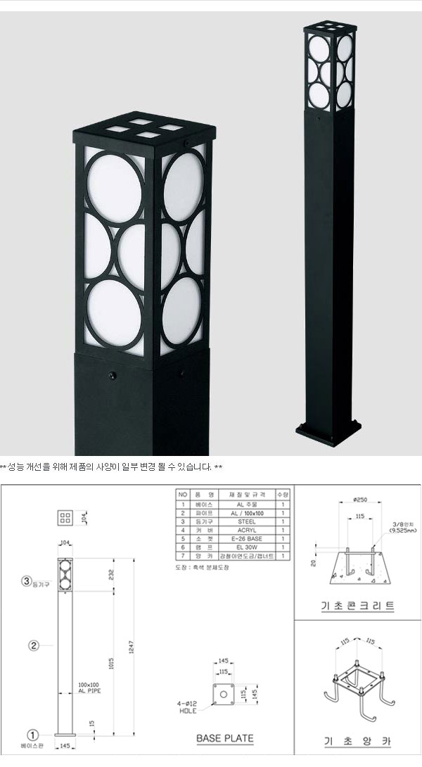 Á¦Ç°¸í : LEDÀܵðµî Á¦Ç°¹øÈ£ : RB JW111G (¼ÒÀç) : Steel (power coating) Body Acryl cover DIFFUSER bolt/nut stainless steel SIZE(mm) : ¤±104 H1247 LAMP : LED 8W VOLTAGE : 220V COLOR : Warm White / White option SERVICE(¿ëµµ) : Plaza, Park, Lawn, Residential areas (¡Øµî±â±¸ »ö»ó, Ä¡¼ö µî »ç¾çÀÌ Á¶±Ý ´Ù¸¦ ¼ö ÀÖ½À´Ï´Ù)