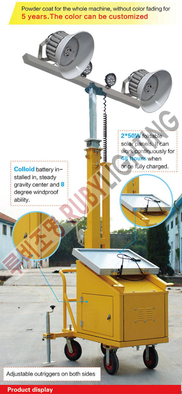Á¦Ç°¸í : LEDÀÛ¾÷µî À̵¿½Ä Â÷·® (¼Ö¶óÆ®·¹ÀÏ·¯) LEDÀÛ¾÷µî½ºÅĵå LEDŸ¿ö¶óÀÌÆ® (ºñ»ó»ê¾÷µî) Model No : RB ST21 (RB VS30) LED : LEDÅõ±¤µî 250W * 2µî/AC220V ¶Ç´Â LEDÅõ±¤µî 30W * 2µî/DC12~24V etc, Customized Power Supply : Solar Application : Highway Solar Panel : 2*50W Mono Axle No : Portable trolley Color : Yellow (standard) / Black / White etc, Customized Battery : 1* 50 AH (option) Size : 1200*600*1100 mm Weight : 205 kgs Mast Raise/Extension : Mechanical ¡ØÀÚ¼¼ÇÑ »ç¾çÀº ´Þ¶ó Áú ¼ö ÀÖ½À´Ï´Ù