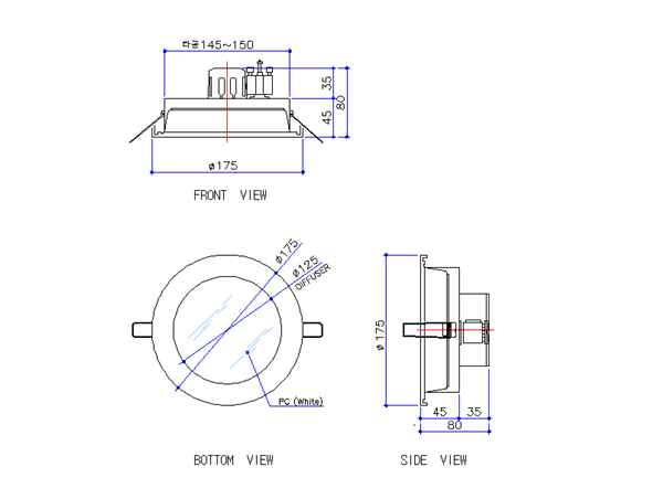 Å©±â : ¥Õ175¡¿H80 Ÿ°ø ¥Õ145~150 ¼ÒºñÀü·Â (W) : 12W / 15W ÀÔ·ÂÀü¿ø (Voltage) : AC 220V / 60Hz ¿ª·ü (PF) : 0.9 ÀÌ»ó »ö¿Âµµ : Àü±¸»ö 3000K / ÁÖ±¤»ö 6000K ¿¬»öÁö¼ö (Ra) : 70 ÀÌ»ó LIFE SPAN (¼ö¸í) : 30,000 Hr ÀÌ»ó (»ç¿ëȯ°æ¿¡ µû¶ó ´Ù¸§)