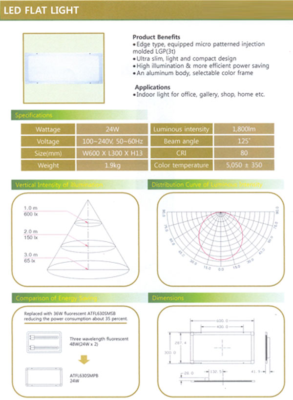 ¿ëµµ : LED FLAT LIGHT (¸éÁ¶¸í) BODY : ALUMINIUM Diffuser : POLYCARBONATE LED TYPE : LED 24W - ¼¿ï¹ÝµµÃ¼Ä¨ Lamp Color : Àü±¸»ö / ÁÖ±¤»ö BEAM ANGLE : 125 ¢ª VOLTAGE : 220V WEIGHT : 1.9 KG CRI : 80 LUMINOUS INTENSITY : 1800LM LIFE SPAN : 30,000Hr (»ç¿ëȯ°æ¿¡ µû¶ó ´Ù¸§)
