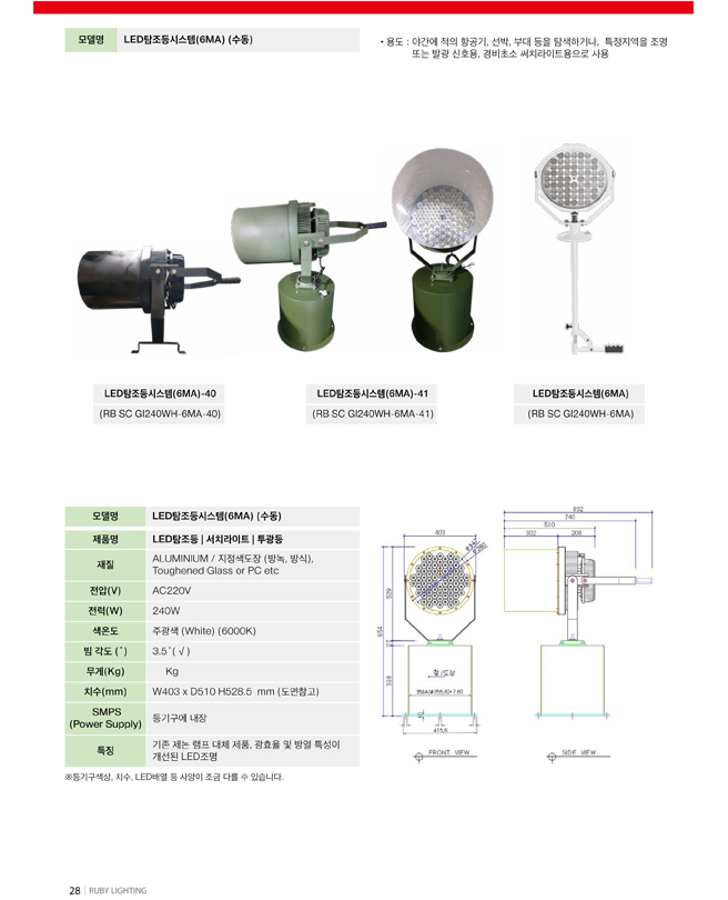 ¿ëµµ : ¾ß°£¿¡ ÀûÀÇ Ç×°ø±â, ¼±¹Ú, ºÎµÎ µîÀ» Ž»öÇϰųª ƯÁ¤Áö¿ªÀ» Á¶¸í ¶Ç´Â ¹ß±¤ ½ÅÈ£¿ë, °æºñÃʼÒÀÇ ¼Ä¡¶óÀÌÆ®, LED°æ°üÁ¶¸í ¿Ü ±âŸ MATERIAL : AL, STS , TEMPERED GLASS & etc POWER(W) : 240W¡¾ VOLTAGE : DC36V (µî±â±¸¿¡ SMPS ³»Àå) |