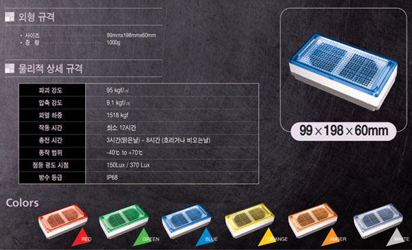 BODY : °í°µµ POLYCARBONATE ABS ÀçÁú SOLAR PANEL : MONO CRYSTALLINE BATTERY : ¹Ý¿µ±¸Àû CAPACITATOR »ç¿ë LED : LED 0.022W (WHITE±âÁØ) Lux : 21 LX (WHITE±âÁØ) WEIGHT : 1.1KG COLOR : W, R, G, B, Y, A Á¡µî½Ã°£ : 1ÀÏ ¾à 10½Ã°£ÀÌ»ó, ºñ¿À°Å³ª È帰³¯ 7ÀÏ ÀÌ»ó Á¡µî °¡´ÉÇÔ ÃæÀü½Ã°£ : ¸¼Àº³¯ 3½Ã°£ , ºñ¿À°Å³ª È帰³¯ 8½Ã°£ ¼Ò¿äµÊ ÀÛµ¿ ¿Âµµ : -40µµ~ +70µµ Ư¡ : ¹Ý¿µ±¸Àû ģȯ°æ Á¶¸í , °£´ÜÇѽðø , Àú·ÅÇÑ À¯Áöºñ¿ë IP RATING : IP68