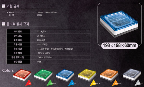 BODY : °í°µµ POLYCARBONATE ABS ÀçÁú SOLAR PANEL : MONO CRYSTALLINE BATTERY : ¹Ý¿µ±¸Àû CAPACITATOR »ç¿ë LED : LED 0.033W (White±âÁØ) Lux : 17.8 LX (WHITE±âÁØ) WEIGHT : 2.1KG COLOR : W, R, G, B, Y, A Á¡µî½Ã°£ : 1ÀÏ ¾à 10½Ã°£ÀÌ»ó, ºñ¿À°Å³ª È帰³¯ 7ÀÏ ÀÌ»ó Á¡µî °¡´ÉÇÔ ÃæÀü½Ã°£ : ¸¼Àº³¯ 3½Ã°£ , ºñ¿À°Å³ª È帰³¯ 8½Ã°£ ¼Ò¿äµÊ ÀÛµ¿ ¿Âµµ : -40µµ~ +70µµ Ư¡ : ¹Ý¿µ±¸Àû ģȯ°æ Á¶¸í , °£´ÜÇѽðø , Àú·ÅÇÑ À¯Áöºñ¿ë IP RATING : IP68