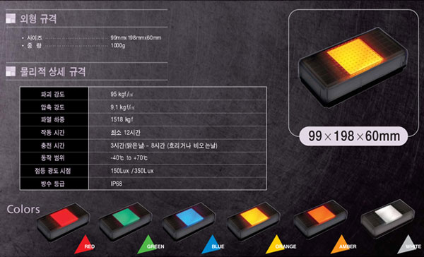 BODY : °í°µµ POLYCARBONATE ABS ÀçÁú SOLAR PANEL : MONO CRYSTALLINE BATTERY : ¹Ý¿µ±¸Àû CAPACITATOR »ç¿ë LED : 0.16W (WHITE±âÁØ) Lux : 37 LX (WHITE±âÁØ) WEIGHT : 1 KG COLOR : W, R, G, B, Y, A Á¡µî½Ã°£ : 1ÀÏ ¾à 10½Ã°£ÀÌ»ó, ºñ¿À°Å³ª È帰³¯ 7ÀÏ ÀÌ»ó Á¡µî °¡´ÉÇÔ ÃæÀü½Ã°£ : ¸¼Àº³¯ 3½Ã°£ , ºñ¿À°Å³ª È帰³¯ 8½Ã°£ ¼Ò¿äµÊ ÀÛµ¿ ¿Âµµ : -40µµ~ +70µµ Ư¡ : ¹Ý¿µ±¸Àû ģȯ°æ Á¶¸í , °£´ÜÇѽðø , Àú·ÅÇÑ À¯Áöºñ¿ë IP RATING : IP68