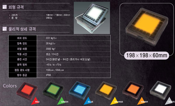 BODY : °í°µµ POLYCARBONATE ABS ÀçÁú SOLAR PANEL : MONO CRYSTALLINE BATTERY : ¹Ý¿µ±¸Àû CAPACITATOR »ç¿ë LED : 0.027W (WHITE±âÁØ) Lux : 36 LX (WHITE±âÁØ) WEIGHT : 2.1 KG COLOR : W, R, G, B, Y, A Á¡µî½Ã°£ : 1ÀÏ ¾à 10½Ã°£ÀÌ»ó, ºñ¿À°Å³ª È帰³¯ 7ÀÏ ÀÌ»ó Á¡µî °¡´ÉÇÔ ÃæÀü½Ã°£ : ¸¼Àº³¯ 3½Ã°£ , ºñ¿À°Å³ª È帰³¯ 8½Ã°£ ¼Ò¿äµÊ ÀÛµ¿ ¿Âµµ : -40µµ~ +70µµ Ư¡ : ¹Ý¿µ±¸Àû ģȯ°æ Á¶¸í , °£´ÜÇѽðø , Àú·ÅÇÑ À¯Áöºñ¿ë IP RATING : IP68
