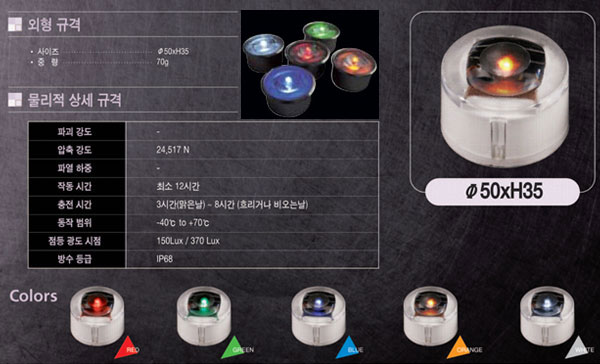 BODY : °í°µµ POLYCARBONATE ABS ÀçÁú SOLAR PANEL : MONO CRYSTALLINE BATTERY : ¹Ý¿µ±¸Àû CAPACITATOR »ç¿ë LED : 0.0024W (WHITE±âÁØ) Lux : 41.3 LX (WHITE±âÁØ) WEIGHT : 80 G COLOR : W, R, G, B, Y, A / FLASH Á¡µî½Ã°£ : 1ÀÏ ¾à 10½Ã°£ÀÌ»ó, ºñ¿À°Å³ª È帰³¯ 7ÀÏ ÀÌ»ó Á¡µî °¡´ÉÇÔ ÃæÀü½Ã°£ : ¸¼Àº³¯ 3½Ã°£ , ºñ¿À°Å³ª È帰³¯ 8½Ã°£ ¼Ò¿äµÊ ÀÛµ¿ ¿Âµµ : -40µµ~ +70µµ Ư¡ : ¹Ý¿µ±¸Àû ģȯ°æ Á¶¸í , °£´ÜÇѽðø , Àú·ÅÇÑ À¯Áöºñ¿ë IP RATING : IP68