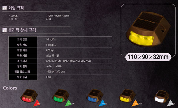 BODY : °í°µµ POLYCARBONATE ABS ÀçÁú DIFFUSER : POLYCARBONATE SOLAR PANEL : MONO CRYSTALLINE BATTERY : ¹Ý¿µ±¸Àû CAPACITATOR »ç¿ë LED : 0.019W (WHITE±âÁØ) Lux : 36 LX (WHITE±âÁØ) WEIGHT : 0.39 KG COLOR : W, R, G, B, Y, A / FLASH Á¡µî½Ã°£ : 1ÀÏ ¾à 10½Ã°£ÀÌ»ó, ºñ¿À°Å³ª È帰³¯ 7ÀÏ ÀÌ»ó Á¡µî °¡´ÉÇÔ ÃæÀü½Ã°£ : ¸¼Àº³¯ 3½Ã°£ , ºñ¿À°Å³ª È帰³¯ 8½Ã°£ ¼Ò¿äµÊ ÀÛµ¿ ¿Âµµ : -40µµ~ +70µµ Ư¡ : ¹Ý¿µ±¸Àû ģȯ°æ Á¶¸í , °£´ÜÇѽðø , Àú·ÅÇÑ À¯Áöºñ¿ë IP RATING : IP68