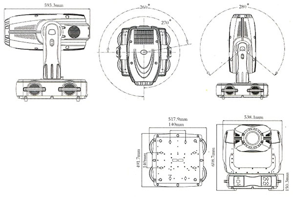 ¡á Lamp: PHILIPS MSR 1200 SA ¡á Power supply: AC220V/50HZ ¡á Power consumption: 1500W ¡á 24DMX control channels ¡á Major features include a versatile CMY Color mixing system£® ¡á variable CTO plus an additional Color wheel£® ¡á High-speed rotating 4 facet prism ¡á Incredibly flexible 13 42 degree linear zoom£® ¡á Color wheel 6 replaceable 'SLOT&LOCK' Colors+open ¡á Gobo wheel 1£º6 rotating,indexable, replaceable 'SLOT&LOCK' dichroic glass gobos+open ¡á Gobo wheel 2£º6 rotating, indexable, replaceable 'SLOT&LOCK' dichroic glass gobos+open ¡á Iris: Motorized, stepless ¡á Effect wheel: 4 rotating, indexable,replaceable 'SLOT&LOCK' prisms and effects+open ¡á Frost effect: Separate, variable ¡á Dimmer/Shutter: Full range dimming and variable strobe effect ¡á Pan movement range 530o, tilt movement range 280o ¡á Automatic pan/tilt position Correction ¡á Selectable 8 or 16 bit pan/tilt movement resolution ¡á Focus: 2m-infinity ¡á Dimensions(L*W*H)£º640*550*880mm ¡á Weight: 85kgs
